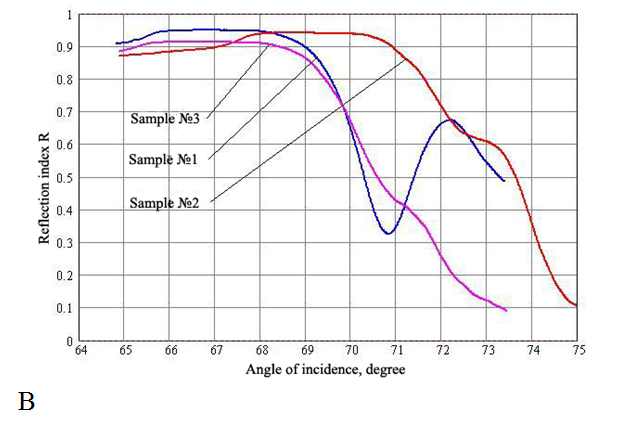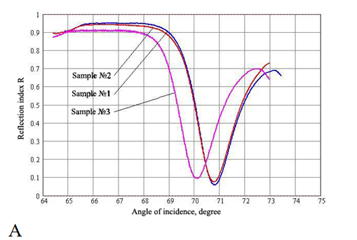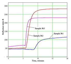The measured dependences of the reflection coefficient R on the angle of incidence of laser radiation onto the samples with non-polymerized and polymerized adhesives are shown in Figure 2. Represented in Figure 2A are the reflection curves for three adhesives. The V-like part of reflection curves is the SPR curve. This part can be characterized by the angular position and reflection coefficient in the curve minimum. The angular position enables to determine the refraction index of the substance studied (adhesive, in our case), and the reflection coefficient in the curve minimum – the adhesive absorption. As seen from Figure 2A, within the range of angles 64.5…66 degrees there are Brewster’s angles (TIR). The level of R within the range of angles 66…68 degrees also indicates the adhesive absorption. Therefore, it should be concluded that the adhesive 3 has higher absorption, although it possesses lower refraction index at the same time. The kinetics of polymerization process is shown in Figure 3. It describes time changes in reflection coefficient values for three samples. The initial value of this quantity corresponded to the point on the left slope of the SPR curve for each adhesive before polymerization. This point is related with the definite angle of incidence of the laser beam onto the boundary “gold – adhesive”. During polymerization, the SPR curve shifted to the right. As a result, the chosen point rose up along the slope of the curve, and the value of reflection coefficient increased. Each adhesive polymerizes with a different velocity. It is seen via the slope of kinetic curves. The highest velocity of polymerization was observed for the adhesive 3 (2100 arb.un./min), the lowest one – for the adhesive 1 (300 arb.un./min), and adhesive 2 (1200 arb.un./min). Thus, the polymerization velocity of the adhesive 3 is 7 times higher than that of the adhesive 1 and practically 2 times higher than for the adhesive 2. Numerical calculations enabled to determine indexes of refraction n for adhesives before and after polymerization (Table 1). Adduced in this table are the values of Brewster angles (ΘБ) as well as angular positions of SPR curves minima (Θmin) expressed in angular degrees before and after polymerization. Also, there adduced are relative augmentations in percents of the angle values (δΘmin, δΘБ) as well as absolute augmentations of the adhesive refraction index Δn.