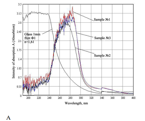 Material and methods: To measure optical parameters of the studied samples, we used the following devices: spectrometer Plasmon-71, spectrophotometer Fluorotestnano-2S, spectrophotometer UNICO 4802 UV/VIS. As a source of UV radiation, we used semiconductor LED with the mean wavelength in its spectrum 406 nm. As the objects for measurements, we used three samples, and each one represented the three-layered structure (glass–adhesive–glass) and, separately, three respective adhesives. All the glass elements of these samples were plates with the thickness 0.2mm and dimensions 20×20 mm from the glass with the refractive index n=1.61 with regard to vacuum. The sample differed between each other by composition of adhesives.