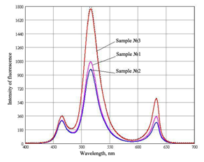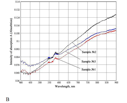 Investigation of characteristics inherent to the transmitted light passing through the studied samples (three-layered structures “glass – adhesive – glass”) was performed using the spectrophotometer UNICO 4802 UV/VIS having the operation range of wavelength scanning 190…1100nm. Before each measurement, we carried out calibration. The step of measurements was 0.5nm. The measurements were performed in the regime for determining absorption (regime A). This spectrophotometer has two channels: the reference (basic) and measuring ones. The result of measurement is the difference of signals at the output of both channels. It means that there performed is comparison of light passage through these channels. At first, we measured absorption of the glass substrate relatively to air. In this case, this substrate was placed into the measuring channel, while the reference channel contained only air. Then, the measured glass substrate was placed into the reference channel, and the measuring channel was sequentially filled with the three samples of adhesives. Thus, we measured the adhesive absorption relatively to the glass. Investigation of fluorescence characteristics inherent to the studied samples (three-layered structures “glass – adhesive – glass”) was performed using the spectrophotometer Fluorotestnano-2S with the operation wavelength range 313…900nm. The scanning step was 0.322nm. As the exciting radiation sources, we used LEDs with the wavelengths 463, 515 and 631nm. At the very beginning, we measured fluorescence of the glass substrate without any adhesive. Then, this operation was repeated with the samples of adhesives. Before each measurement, we carried out calibration. In the spectrophotometer Fluorotestnano 2S, the optical axes of the source and detector of radiation are allocated at the angle 90° relatively to each other, while the studied sample – at the angle 45° both relatively to the radiation source and to detector. It gives the possibility to fix the light reflected from the sample. The results obtained using the spectrophotometers were processed by the specially developed program and kept in PC.