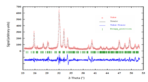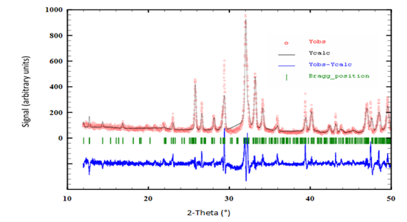 Figure 1 shows the representative powder X-ray diffraction patterns of calcium phosphate Ca3(PO4)2 taken from the mining center in Khouribga, recorded in a 2θ range from 10° to 52°. The automatic search of diffraction peaks, the refinement of their positions as well as the profile setting with the Win PLOTR program allows to obtain the precise positions of the lines in the diagram. All the reflection peaks were indexed in the monoclinic system (P2/m space group). The parameters generated by Full prof program are a=13.5 Å b=6.7 Å c=8.4 Å and β=93.9°. Direct cell parameters and volume, agreement factors are shown in Table 1 & Table 2 presents the hkl Bragg reflections (i.e., its position, width and intensity) obtained from Rietveld method, and the inter planar spacing that was calculated using Bragg’s law which relates dhkl to 2θhkl.