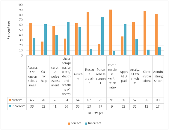 In item wise skill assessment, the common incorrect or missed steps were like calling for help (62%), Quality chest compression (rate, depth and recoiling of chest) 66%, pulse reassessment (77%) and correct AED pads placement (62%) as shown in Figure 1.