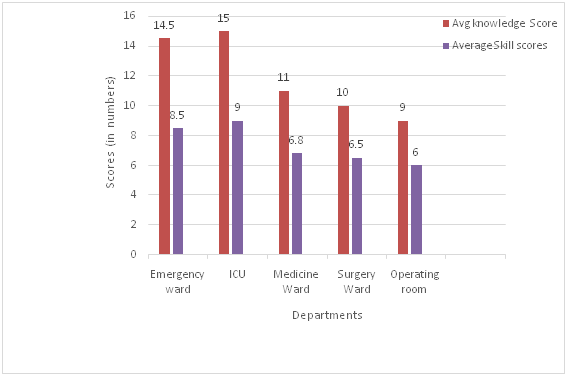 With regard to knowledge and skill of subjects posted in different departments, the nursing officers from ICU, emergency department had better knowledge and skill as show in Figure 2.
