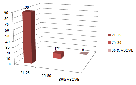 The above table reveals that out of 50, the age group 21 to 25 undergone the 45(Table 1) students, about 90% percentages. In the age group 25 to 30 the frequency is 5 and the percentage is 10. In the age group 30 and above about 0%. Graphs 1–4