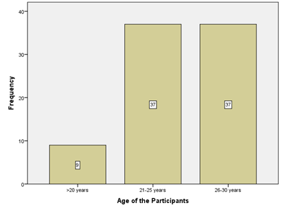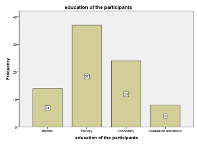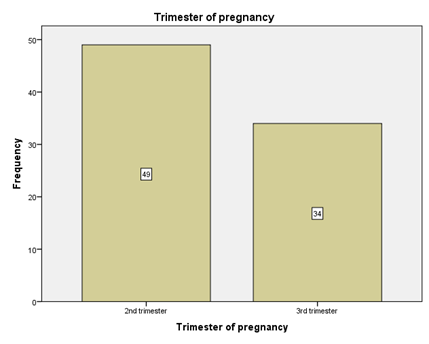 The above Graph reveals that n=9 (10.8%) were less than 20 years, 37 (44.6%) and 37 (44.6%) were age 21-25 and 26-30 respectively Figure 1 & Figure 2. Looking at the above graphs it shows that n=14 (16.9) were Illiterate, n=37 (44.6%) were Primary, n=24(28.9%) were having secondary education while, n=8 (9.6%) were having graduation and above. The above graph highlights that n=49 (59%) were in 2nd trimester while remaining n=34 (41%) participants were in 3rd trimester and trimester one was excluded Figure 3.