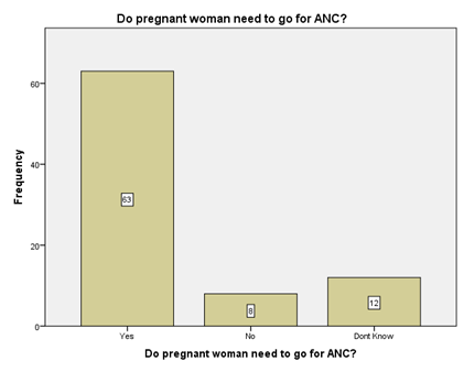 Result: When a question was asked if pregnant woman need to go for ANC in response, (75.9%) of the participants had knowledge. When participants were asked about ANC in the absence of complication during pregnancy? (74.7%) of the participants had knowledge regarding this question. When they were asked if there is need of TT vaccine during pregnancy? In response n=55 (66.3%) said yes they need. The participants were asked about the harmful role of smoking and alcohol for fetus. 74 (89.2%) participants