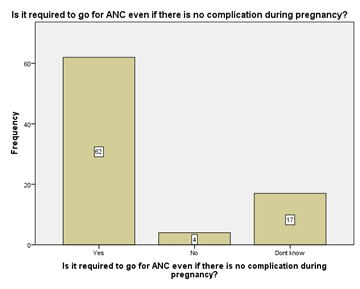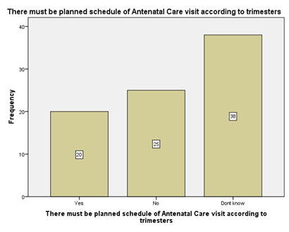 When a question was asked if pregnant woman need to go for ANC? The results are presented in above graph which shows that n=63 (75.9%) responded Yes, n=8 (9.6%) Responded with no and n=12 (14.5%) said that they don’t know Figure 4 &Figure 5. On a question is it required to go for ANC even if there is no complication during pregnancy? The results were recorded in the above graph n=62 (74.7%) responded said Yes, n=4 (94.8%) Responded said no and n=17(20.5%) participants said that they don’t know On a question that there must be planned schedule of Antenatal Care visit according to trimesters the following results were found. The results reveals that n=20 (24.1%) said that yes it should be, n=25 (30.1%) said that there should be no regular visits, and n=38(45.8%) said that they don’t know about routine schedule visits Figure 6.