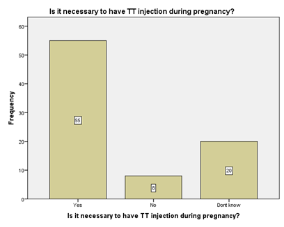 The participants were asked if there is need of TT vaccine during pregnancy. In response n=55 (66.3%) responded Yes, n=8 (9.6%) Responded with no and n=20(24.1%) said that they don’t knows shown in the above graph Figure 7 &Table 1.