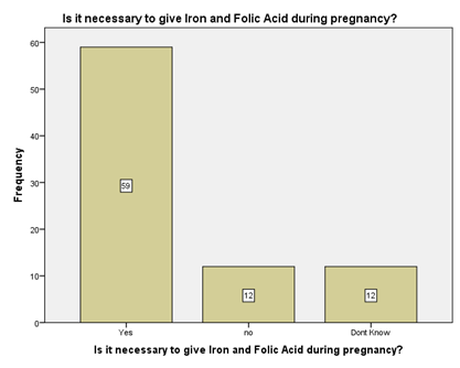 The participants were asked about the need of Iron and Folic acid use during pregnancy on which the participants replied as under. Among the participants n=59 (79%) said that Yes it is necessary, n=12 (14.5%) know that iron and folic acid are not needed and n=12 (14.5%) said that they don’t know Table 2.