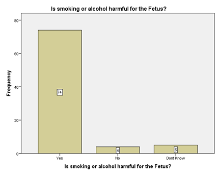 The results of above table shows that n=50 (60.2%) responded Yes that Iron and Folic acid are necessary for fetal growth and development, n=16 (19.3%) Responded with no and n=17 (20.5%) said that they don’t know about Folic acid and iron role in fetal growth Figure 9. The participants were asked about the harmful role of smoking and alcohol for fetus. 74 (89.2%) participants replied that it is harmful, n=4 (4.8%) Responded with no and n=5 (6%) said that they don’t know the harmful role of smoking and alcohol use in pregnancy Figure 10.