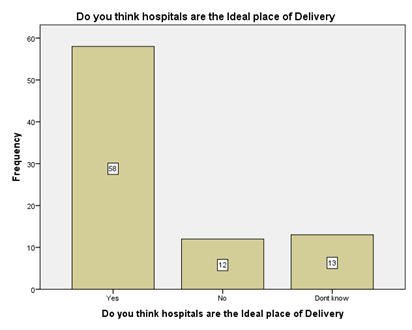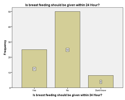 The participants were asked if pregnant women need extra nutrition, majority n=62 (74.7%) replied that yes they need, n=8 (9.6%) Responded know that they don’t need and n=13 (1.7%) said that they don’t know about the nutritional requirement in pregnancy Figure 11. When a question was asked if the hospital are the ideal place for delivery. The results are presented in above graph which shows that n=58 (69.9%) responded Yes, n=12 (14.5%) Responded with no and n=13 (15.7%) said that they don’t know Figure 12. The above graph reveals that n=25 (30.1%) participants believe that breast feeding should be started in first 24 hours, n=50 (60.2%) said that no it should be started after 24 hours while n=8 (9.6%) said that they don’t know about it.