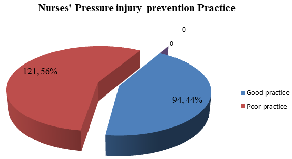 Conclusions: In this study the majority of nurses had poor practice towards pressure injury prevention. Education, knowledge, training, Nurses to patients ratio, work experience and satisfaction with nursing leadership were factors affecting pressure injury prevention practice of nurses.