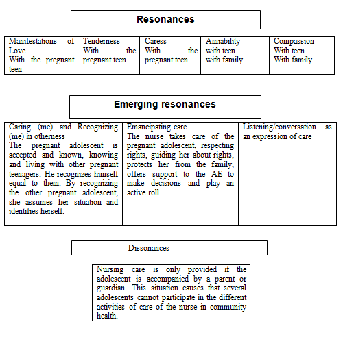 Once analyzing the speeches of community health nurses who care for pregnant adolescents (AE), in relation to the resonance category of care for life, the following empirical sub categories emerged: love, tenderness, caress, kindness, the compassion. Emergent resonances also emerged: Recognizing (me) in otherness, Listening/conversation as an expression of love and emancipatory care. Dissonances found: Nursing care is only provided if the adolescent is accompanied by a parent or guardian, a situation that limits the pregnant adolescent's participation in the different activities organized by the community nurse (Figure 3).