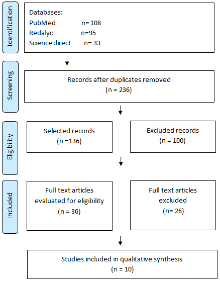 Selection of studies: The selection of studies was carried out according to the eligibility criteria, for which the bibliographic manager MENDELEY was used to organize the articles found, eliminate duplicates and articles that did not meet the established criteria. In addition, the PRISMA flowchart was used to disseminate the articles found.