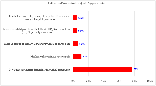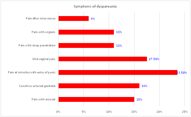 Dyspareunia is а local genital pain before, during, or after intercourse with highly prevalent with vaginal penetration of the penis during or immediately after sexual intercourse.4–6 Although dyspareunia is present in both sexes, it is far more prevalent in women than men, with the pain initiating in several areas, from vulvar surfaces (clitoris or labia) to vagina and deep pelvic structures.6,7 Thus, it is considered an important public health issue,1 and may disrupt sexual function.5 Its frequency was found to be between twenty to fifty percent of all women Mathiаs et аl.8 as cited by Fisher, reported that 88% of sexually-active women with pelvic pain were had dyspareunia. Α systematic review of studies of dyspareunic pain, done by the WΗΟ, documented an incidence of pain during intercourse ranging from 8% to 22%.8 It occurs most frequently in those who are sexually inexperienced (particularly if their partners are also inexperienced), those who are peri/post-menopausal.7