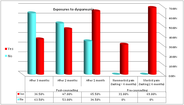 The population prevalence of dyspareunic pain is estimated to vary from 3%: 18% globally, 10 and lifetime estimates range from 10%: 28%.36 Wide range reflects а significant heterogeneity in methodologies of prevalence studies.10 While assessing the outcome of the counseling process on participants’ intensity of dyspareunic pain throughout the period of study data analysis revealed that, before counseling, more than two thirds (69.0%) of studied sample suffered from morbid dyspareunia (painful sex lasting 6 months or more) compared to 31.0% of them suffered from non-morbid dyspareunia (painful sex lasting less than 6 months). The higher incidence reported in our study compared to other studies shows the sharp difference in cultural ideologies between studied subjects, coupled with rampant illiteracy and poverty and early marriage which is commonplace in our setting. This result supported by those researchers, who reported that the majority of Egyptian women had dyspareunia during intercourse.37 However, these results are contradicted Mitchell’s results who mentioned that, painful coitus lasting three months or more in the last year is not uncommon; it is reported by 7.5% of the studied women, of whom one-quarter (i.e. 1.9% of all sexually active women) report morbid painful sex (symptoms occurring very often or always, symptoms experienced for more than six months and fairly or very distressed about the difficulty).10 While after implementation of the counseling process, using validated measurements, progressive improvements in dyspareunic pain was observed and the gains were maintained at the one to three months’ follow-up. Overall, 34.5% of women indicated that their pain had alleviated within one month, 53.0% within 2 months and 63.5% within 3 months after implementation of the PLӀSSӀΤ counseling model.