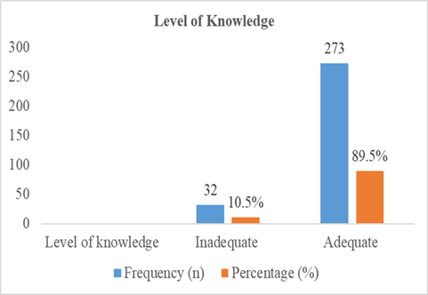 In assessing the respondents' level of knowledge about COVID-19 vaccination, the study utilized a series of questions, with those answering at least 50% correctly considered to have adequate knowledge. Figure 1 presents the findings, revealing that a significant majority, 89.5% (n=273), demonstrated adequate knowledge. In contrast, a minority of respondents, specifically 10.5% (n=32), were identified as having inadequate knowledge regarding COVID-19 vaccination. This insight into the level of knowledge among the respondents sets the stage for a more comprehensive understanding of the factors influencing COVID-19 vaccination, as discussed in the subsequent sections of the study.