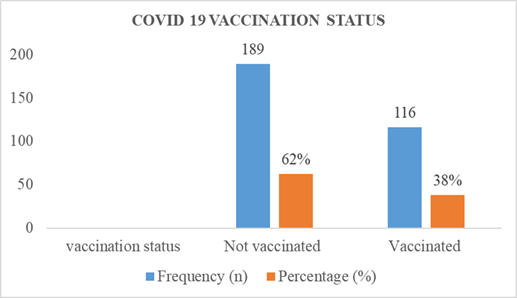 Figure 2 illustrates the COVID-19 vaccination status of the respondents, determined through direct inquiries about whether they had received the vaccine. The results indicate that 38.0% (n=116) of the respondents were vaccinated against COVID-19, while the majority, accounting for 62.0% (n=189), had not received the vaccine. This visual representation provides a clear overview of the distribution of vaccination status among the study participants, forming a crucial foundation for further analysis and discussions regarding the associations between vaccination status and other variables examined in the study.