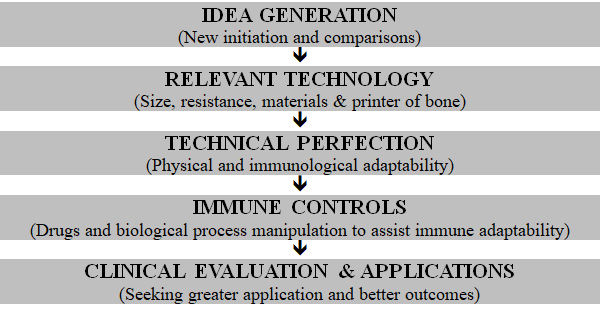 Many other bone materials and technologies have been attempted in the clinic.14–18 New therapeutic ideology and technical capability are proposed to improve bone disease treatment. Technical or computation-driven new surgical skills, like bone tissue printing, robot-aid surgery are the future trends. More recently, new biomedical problems are emerged in bone surgery. In this Article, we discuss issues of bone-replace surgery skills, advances for tissue replaces in new bone-like materials and other related techniques. These related issues from idea generation to possible ways of surgical realistic are shown in Figure 1. The key issues in these different parts of surgery improvement and successful rates is to increase the capability of materials to endure human immune systems to less reject to new plants. These processes are included in bone material optimization in different patients, potential drugs to reduce human rejection and small wound of surgery processes in patients. (Figure 1)