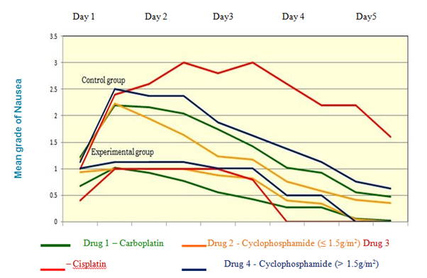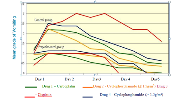 The children in the control group had experienced moderate to severe vomiting episodes for all 4 drugs. The severity of vomiting was more for the drug 3 Cisplatin and drug 4 Cyclophosphamide (high risk) than the drug 2 Cyclophosphamide (moderate risk) and drug 1 Carboplatin. The children had vomiting during all the 10 assessments. They were not found free from vomiting during the assessment period.14