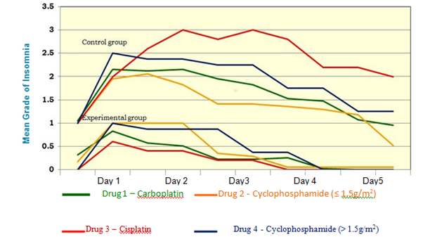 The children in the control group experienced moderate to severe sleep disturbances for all the 4 drugs during all the 10 assessments. The sleep disturbances was found severe and moderate for the drug 3 Cisplatin, drug 4 Cyclophosphamide (high risk) than the other two drugs. For drug 2 Cyclophosphamide and drug 1 Carboplatin the children had mild and moderate sleep disturbances. The children had sleep disturbances during all the 10 assessments and they were not able to sleep well during the assessment period.
