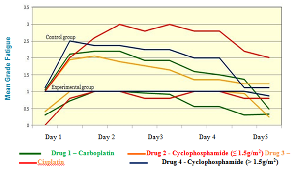 The children in the control group experienced moderate to severe fatigue for all the 4 drugs during all the 10 assessments. The severity of fatigue was more for drug 3 Cisplatin than the drug 4 Cyclophosphamide (high risk). For the other two drugs Carboplatin and Cyclophosphamide (moderate risk) the children had moderate to mild grade fatigue during all the 10 assessments. The children were not found free from fatigue during the assessment period.