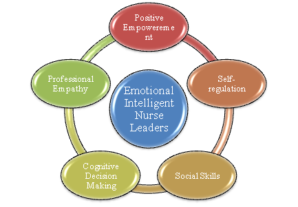 Figure 1 Emotional intelligence carries with it a string of virtues which has strong significance among nursing leaders. Akerjordet5 reports that emotional intelligence is associated with positive empowerment a ability which is characterized by stronger self-awareness and supervisory skills. The combination of these virtues helps the nurse leaders to introspect the challenges and unsuccessful standards from their previous experiences and devise customized strategies to overcome the identified barriers. Cooper6 quoted that possession of emotional intelligence provides a drive and passion to lead. In this article his focus also includes self-regulation and social skills. These virtues contradicts the olden day styles of leadership, in which nurse leaders had the authority to enforce, extract and extinguish the abilities of their subordinates. When the virtue of self-regulation is activated subordinates are provided tasks which can be accomplished within the scope of their abilities, resources and time. Social skills is implemented by participative leadership, which eliminates the positional distance between the leader and the subordinate and provides room for clarification, opinions and innovations. Eason included the abilities of cognitive decision making and professional empathy to the characteristics of emotional intelligence. Emotional intelligence virtues has eradicated the stereotyped decision making efforts taken by nurse leaders based on policies and protocols. Decision making is a dynamic process among nurse leaders with emotional intelligence. It changes according to the cause, nature and consequences of the issue or challenge. The nurse leader employs her past knowledge and investigates current evidence based literature for solutions before deducing a decision. Empathy was never in the realm of leadership characteristics, however initiating this virtue in practice settings, eliminates the fear of control and facilitates freedom to express, explore and experiment. Nursing leaders with these virtues possess a charisma, which draws their subordinates towards them, which facilities effective and efficient delegation of tasks and also improves the organizational outcomes.