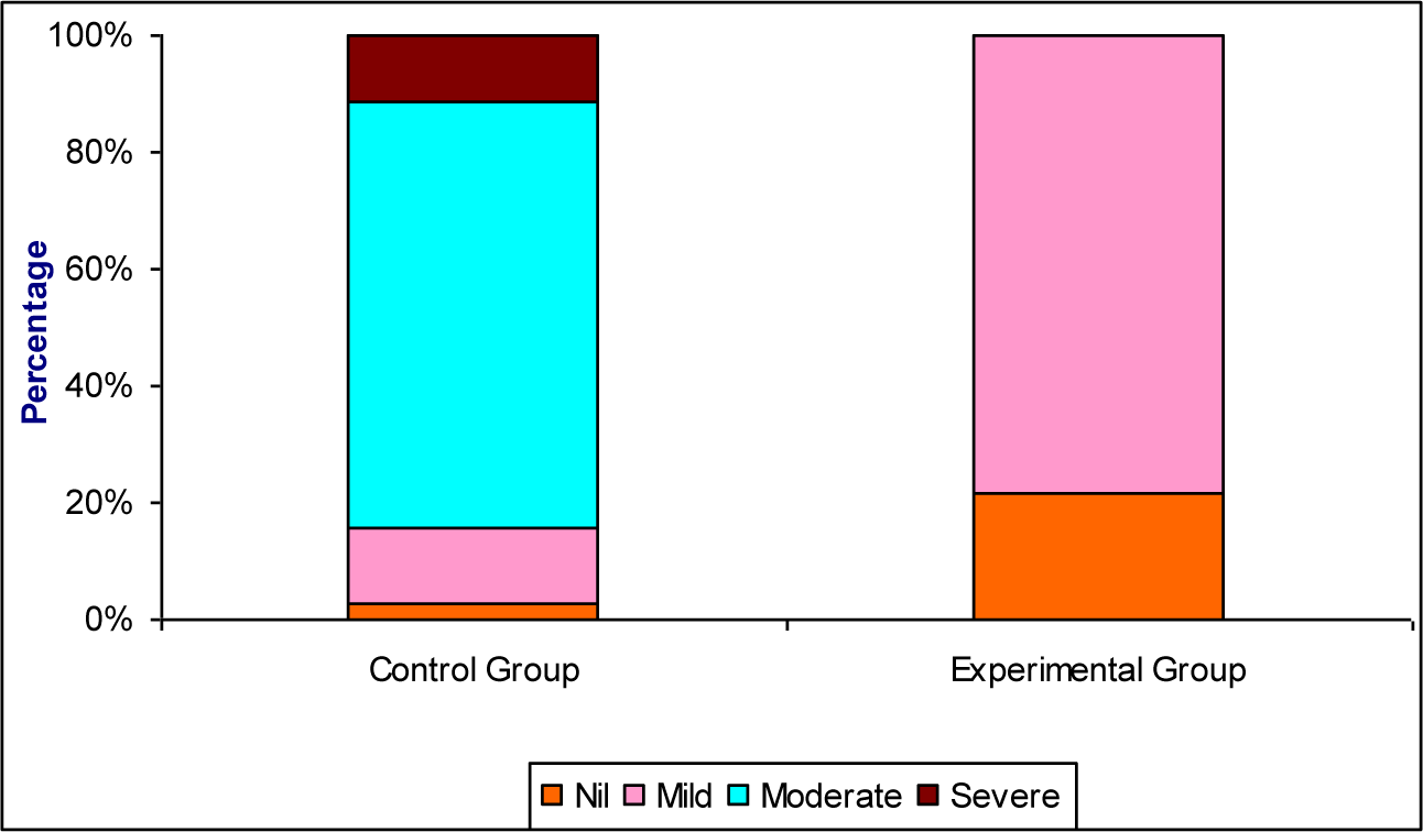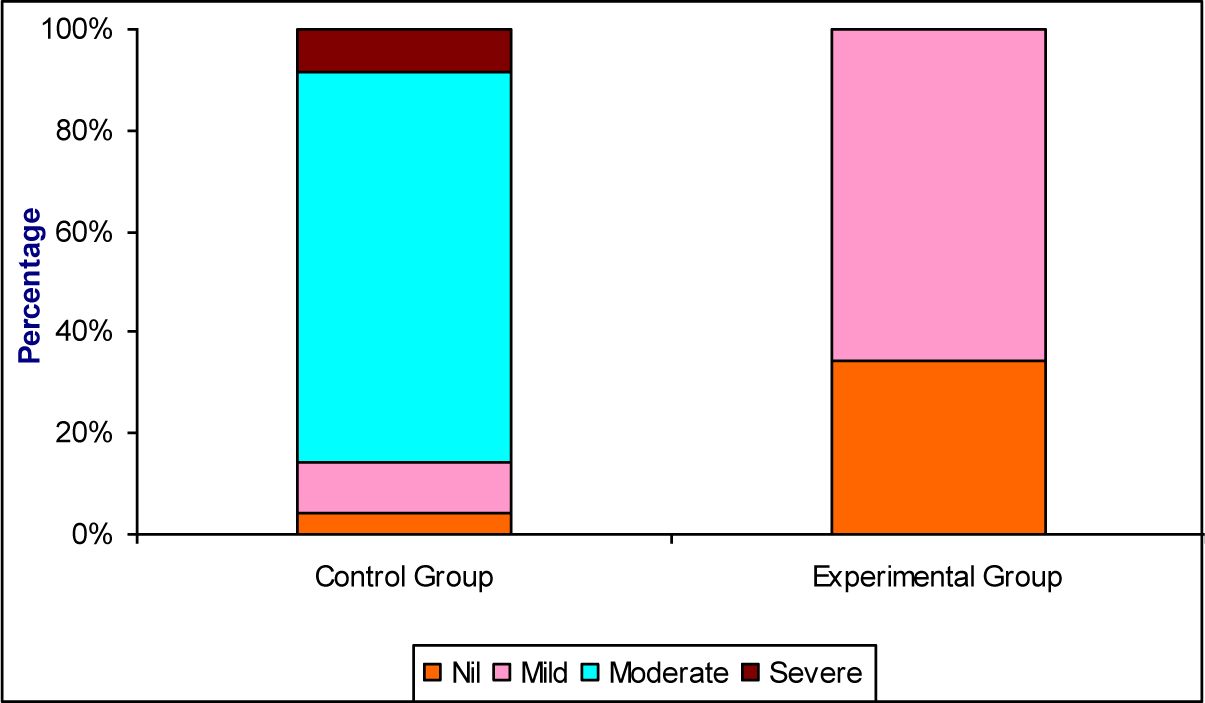 In control group15 (21%) subjects did not have any specific pain. 49(70%) subjects had mild pain not interfering with normal function and Activities of Daily Living (ADL), 6(8.5%). subjects experienced moderate grade pain. In the experimental group, 54(77%) subjects did not have any specific pain. 16(22%) had mild pain and 6(8.5%) subjects had moderate pain. None of them in the control or experimental group had severe pain experiences(Figure 1-3 & Table 1-3).