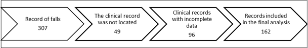 Record of falls of patients hospitalized between 01 January 2016 and 31 December 2022, who fell during hospitalization. A total of 307 fall records were identified. Clinical records were located to collect the variables of interest (Figure 1).