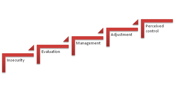 The analysis reached saturation and revealed that perceived control was influenced by the patients’ experiences of bodily symptoms. Five categories emerged, mirroring a step-by-step process. The first step, insecurity, was followed by evaluation, management and adjustment to finally reach a higher level of perceived control over one’s life in relation to the heart disease. The results are presented in Figure 1.