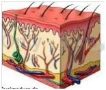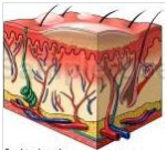 Dermis: It is a connective tissue supporting the epidermis. It consists of fibrin collagen and elastin numerous fibrocytes manufacturing these proteins and support tissue, they consist of two main layers papillary by the epidermis and the denser reticular layer is the dermis including the sensor to the heat called Ruffini and free nerve endings sensitive to pain and temperature in the case of a skin burn.