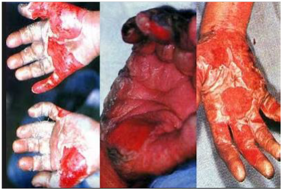 Call scorch are those involving only the epidermis, the outermost layer of the skin. Symptoms include severe pain and local redness, but with pale skin when touched. Generally improve in the range of 3 to 6 days and can exfoliate and leave no sequelae (Figure 1 & 2).