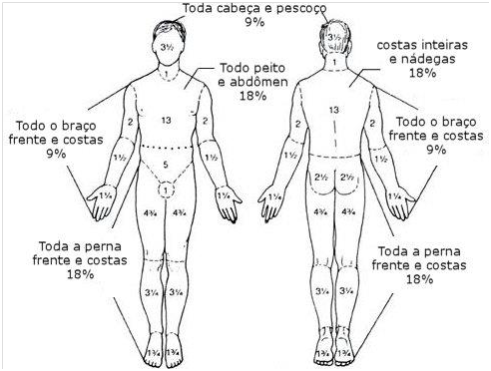 In addition to the depth of the burn, it is also important the extent of injury. All patients with lesions 2nd or 3rd grade must be assessed in relation to the percentage of body area reached (Figure 7).