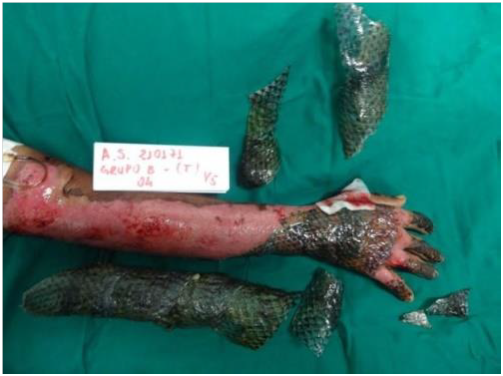 The proposed treatment is believed that the greatest benefit of using tilapia skin burns treatments is due to social benefit because this skin is usually discarded. With tilapia skin you can accelerate the healing process, reduce the need for medications in addition to skin, leaving an aesthetically nicer appearance (Figure 8).