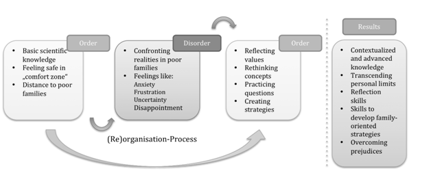 The learning process of the student is a reorganization process. They start with their basic scientific knowledge and feel safe in their comfort zone. From their experiences in their life so far they feel a distance to poor families. Through the confrontation with the realities they are in disorder and feelings like anxiety, uncertainty and deception develop. They reflect their values and rethink their concepts and create strategies to deal with the situations. With this coping strategies they reach a new order. As a result they can contextualize knowledge and transcend their personal limits. The family oriented perspective they developed helps to overcome prejudices they might had before.
