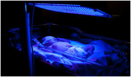 Phototherapy: the main form of therapy for infants with physiologic jaundice is phototherapy, the use of intense fluorescent light on the infant exposed skin it is belived that this light in the blue range acts to decompose bilirubin by the process of photo oxidation, phototherapy is effective in preventing or reducing an increase in bilirubin levels. The infant must be unclothed during treatment Figure 1. In order to prevent chilling, maintaining normal body temperature. The vital signs are taken at least every 4 hours to monitor the infant temperature.3