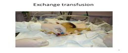 Exchange transfusion: Double volume exchange replacement 85% of circulating red blood cells and reduces bilirubin level by 50%. Bilirubin can be removed from the blood most rapidly with exchange transfusion. It is used in full term infants with a hypebilirubinemia approaching 20 mg per dl and in premature infants with bilirubin level approaching 10 to 15 mg/dl. Exchange transfusion is rarely needed by infants having physiologic jaundice and is usually used for the treatment of hyperbilirubinemia due to blood group incompatibility (Figure 2).
