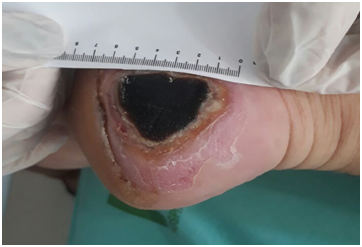 After 10 days of treatment (Figure 2), it is possible to notice epithelial points with presence of tissue with shedding in the wound bed. Mechanical debridement was performed, placed in the bed of the SILVER COAT wound, on the edge of the wound with Alginate and in the distal to the bed AGE was applied.