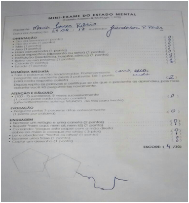 The patient M is the result was 04 points, indicating a severe cognitive impairment, dementia signal. In items "guidance", "attention and calculation" and "Evocation" the patient had a zero score and items "immediate memory" and "Language", the patient had a low score, which indicates a rapid progression above and even with the medication was not possible to avoid this prognosis, indicating failure in clinical treatment and depletion of measures that can improve the quality of life of the patient.