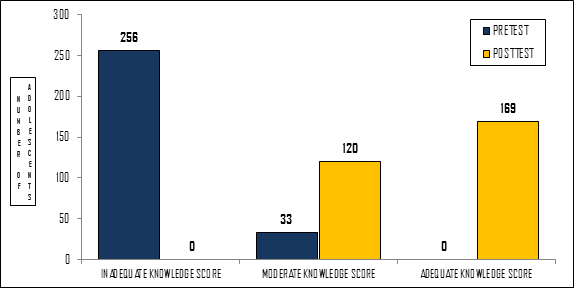 Table 2 shows the distribution of knowledge scores of adolescents regarding breast cancer and its prevention, in pretest 88.58% of them had inadequate knowledge, 11.41% of them had moderate knowledge and none of them had adequate knowledge and in posttest none of them had inadequate knowledge, 41.52% of them had moderate knowledge and 58.47% of them had adequate knowledge signifies the effective impact of instruction module on breast cancer and its prevention (Figure 1).