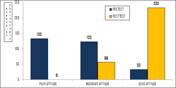 Table 3 shows the distribution of attitude scores of adolescents regarding breast cancer and its prevention, in pretest 46.02% of them had poor attitude, 42.56% of them had moderate attitude and 11.41% had good attitude and in posttest none of them had poor attitude, 19.37% of them had moderate attitude and 80.62% had good attitude signifies the vast improvement in attitude towards breast cancer and its prevention (Figure 2).