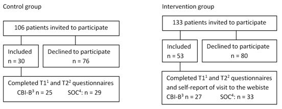 Between April 2010 and April 2011, a total of 239 patients were eligible for participation of whom 83 patients were included: 30 without and 53 with access to the website Figure 1. Data from non-participants was not obtainable. Baseline characteristics are summarized in Table 1 and between-group differences were not statistically significant (p=0.320). All participants had 8 to 14 days between T1 and T2, and T3 and T4, respectively. For those, who had access to the prepared website, the response rate for fully completed questionnaires at both T3 and T4 and combined with self-reported visit to the website, was between 51,0% and 62,3% Figure 1. On the contrary, drop-out rates, as those participants not compliant with our set-up, e.g. not visiting the website when access was given and/or not filling in both the questionnaires, was higher in the intervention group (from 49,0% to 37,7%) than in the control group (from 3,4% to 16,7%) Figure 1.