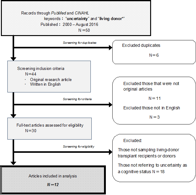 A flow diagram of the selection of studies and inclusion/exclusion process is shown in Figure 1. The keywords “living donor*” and “uncertainty” were used to search PubMed and CINAHL databases. A search was performed to identify studies published between 2000 and August 2016. As selection criteria, studies had to refer to cognitive uncertainty of recipients, donors, and family members in living-donor transplant cases and be original articles written in English. By using Mishel's uncertainty in illness theory1 as a reference, contents related to uncertainty were extracted from the articles. The studies that did not sample living-donor transplant recipients or donors, and did not refer to uncertainty as a cognitive status, were excluded from the analysis.