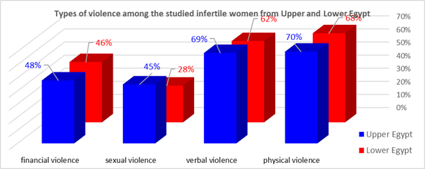All women either upper Egyptian or lower Egyptian infertile women experienced and exposed all forms of domestic violence (physical, verbal, sexual, and financial). There is no statistically significant deference between geographical area (upper or lower) and types of violence experienced by infertile women, however all form of violence were more prevalent among upper Egyptian infertile women.