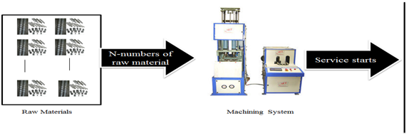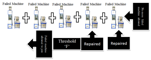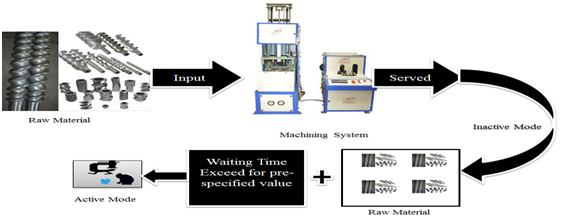 Threshold strategies in queuing/machining system can be easily understood with the help of an example of production system wherein the production of product starts when some specified raw material arrives in the machining system. In machining system, when a machine fails which resultant the delay in production. Also, this shows the reduction in expected profit. In machining system, F-policy states that no more failed machine allowed in the system when it reaches to some fixed capacity. As no of failed machine decreases up to some threshold level further failed machines are allowed to join the system. In the queuing/machining system under D-policy, upon the completion of each busy period, the server/repairman is switched to the inactive mode. Later on, the server/repairman is switched to active mode when the total service/repair times of all customers waiting in the queue exceed some pre-specified value say ‘D’. The pictorial view of N-policy, F-policy and D-policy machining system has been given in Figure 1‒3, respectively.
