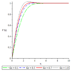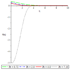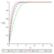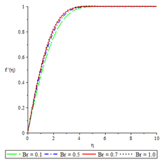 Figures 2 to 6 show the influence of some of the controlling parameters on the velocity boundary layer. The fluid velocity was lower at the plate surface and increased to the free stream value satisfying the far field boundary condition. In Figure 2, the distractive force due to Lorentz force increased as the magnetic parameter increased because there was a very consistent drop in the longitudinal velocity and therefore the momentum boundary layer thickness get thinner. An increase in fluid injection, Grashof number and Brinkman number have the same effects on both the momentum boundary layer and velocity with the Magnetic parameter as shown in Figures 3 to 6.
