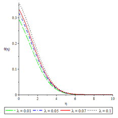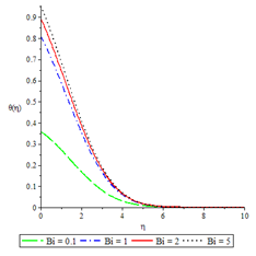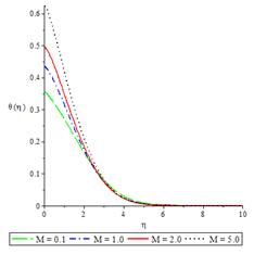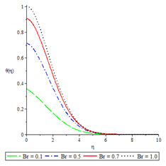 The effects of various controlling parameters on the temperature distribution are shown in Figures 7-14. It is noteworthy that, the temperature reaches its maximum at the permeable plate surface and asymptotically decreases to a minimum zero value far away from the plate, thereby satisfying the boundary condition. Also, increasing the magnetic parameter increases the fluid temperature which in turn, increases the thermal boundary layer. This is attributed to the effect of Ohmic heating on the flow system. An increase in the Biot number gave rise to increase in fluid temperature due to the convective heat exchange between the hot fluid at the lower surface of the plate and the cold fluid at the upper surface of the plate and so there was also a thickening of the thermal boundary layer. The same reason can be given for the Brinkman number, internal heat generation parameter and radiation parameter but an opposite trend was observed by increasing the Prandtl number and fluid injection and so the rate of thermal diffusion was lowered within the boundary layer and a thinning of the thermal boundary layer was also observed.