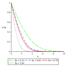 The effects of the controlling parameters on concentration profile were shown in Figures 15-17. The boundary conditions were fulfilled as the graphs indicate maximum concentration at the permeable plate surface and an asymptotical decrease to the prescribed free stream value. Fluid injection and suction, Schmidt number and the reaction rate parameters decreased the rate of mass diffusivity. The solutal boundary layer also decreased for all the three controlling parameters.