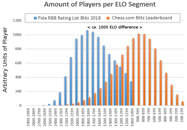 To test this hypothesis, the number of players in blitz games were compared between official RBB FIDE ratings and blitz games on chess.com1 by plotting the relative amount of players per 100-ELO-segment (Figure 1). In fact an unexpected gigantic shift in the curve and peak can be, in fact, observed (Fig. 1). Almost 1000 ELO points subdivide the peaks of both ELO rating systems (Fig. 1). Hence, this further indicates that comparability seems most likely not to be given between such FIDE-ELO and chess.com1 ELO-rating-systems. Comparability of ELO-rating-systems seems not to be given for tournament ELO and other ELO ratings. A major deflation of ELO points must be assumed on online chess websites, as all of them have too low initial ELO values.