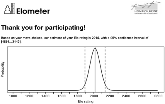 Figure 2 Scientific ELO estimation based on Elometer’s item response theory (January 2018). A 95% confidence interval (dashed lines) is shown for the estimate (solid line). Please notice, this tournament-related scientific estimate of 2015 ELO corresponds to only 1475 ELO at chess.com in the example.