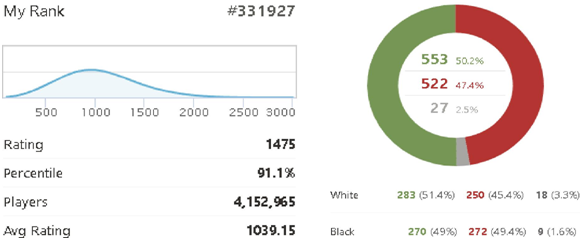 Figure 3 Please notice, this tournament-related scientific estimate of 2015 ELO corresponds to only 1475 ELO at chess.com in a very representative example and it is very likely to be true for most chess players. An ELO of 1475 recently relates to the upper 10% (percentile 91.1%) in January 2018; this seems to be very biased and atypical for real-world chess and a curiosity of online chess only – that should be fixed: via right initial ELO value and by assuring a suitable amount of overall ELO points.